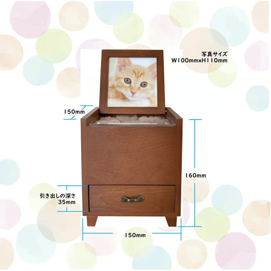 本体サイズは幅150mm×奥行き150mm×高さ160mmで、どこにでも置きやすいコンパクトなサイズです。また、正面にはフォトフレームが付いており、幅100mm×高さ110mmの写真を飾ることができます。大切なペットの写真を一緒に飾り、温かな空間を作り上げます。